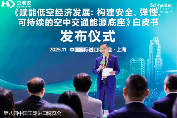 11月5日至10日,遠東智慧能源股份有限公司(簡稱:遠東股份,股票代碼:600869)旗下的北京京航安機場工程有限公司(以下簡稱:京航安)首次以參展商身份亮相第八屆中國國際進口博覽會,并與全球能源管理與自動化領域數字化轉型專家施耐德電氣簽署戰略合作協議,共同發布《賦能低空經濟發展:構建安全、彈性、可持續的空中交通能源底座》白皮書,攜手助力民航產業綠色化、智慧化新未來。