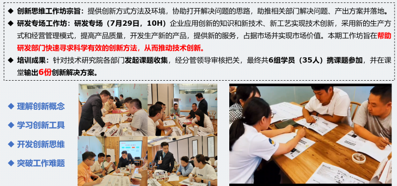 對于創(chuàng)新來說,方法就是新的世界,最重要的不是知識,而是思路。企業(yè)應(yīng)用創(chuàng)新的知識和新技術(shù)、新工藝實(shí)現(xiàn)技術(shù)創(chuàng)新,采用新的生產(chǎn)方式和經(jīng)營管理模式,提高產(chǎn)品質(zhì)量,開發(fā)生產(chǎn)新的產(chǎn)品,提供新的服務(wù),占據(jù)市場并實(shí)現(xiàn)市場價值。為幫助核心部門快速尋求科學(xué)有效的創(chuàng)新方法,從而推動技術(shù)創(chuàng)新,創(chuàng)新力學(xué)院根據(jù)不同主題開展創(chuàng)新思維工作坊。