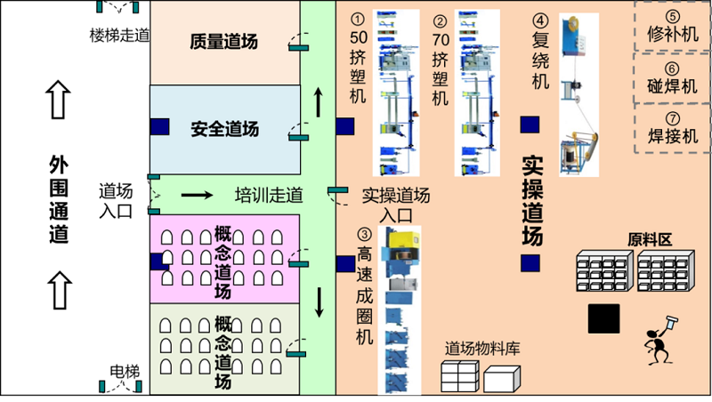 遠東大學生產(chǎn)學院致力于打造行業(yè)內首家一線員工實訓道場,道場分為概念道場、安全培訓區(qū)、質量培訓區(qū)及精益實操道場四大培訓區(qū)域,旨在為公司培養(yǎng)具有發(fā)現(xiàn)問題、改善問題的能力、并掌握高水平實操技能的員工。概念道場即理論培訓道場,以傳統(tǒng)課堂式、案例研討式、課題式等培訓方式,對參訓學員從思想認知方面進行工藝理論等知識的教學;安全道場結合人、機、料、法、環(huán),設計危險源識別及預防相關道具,通過安全事故案例進行安全教育;質量道場以質量事故案例警示教育和質量問題產(chǎn)品展示為主,通過系統(tǒng)性的質量培訓,培養(yǎng)員工的質量意識,提高員工對產(chǎn)品缺陷的識別能力;精益實操道場主要通過情景模擬教學形式,以道場內的設備進行設備維護、自主保養(yǎng)、快速換模、標準化作業(yè)等培訓內容,是員工理論培訓與實際操作相結合的堅實平臺。