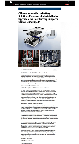 3月18日美聯社訊,中國機器人生態鏈正迎來關鍵部件領域的創新突破。中國電池制造商遠東智慧能源股份有限公司(簡稱:遠東股份 代碼:600869)旗下的遠東電池近期憑借其創新研發的21700-6000mAh圓柱電池組,正在為機器人領域的發展貢獻自身力量。該電池組已成功搭載于中國頭部科創中心研發的第四代工業四足機器人,為復雜場景下的機器人應用提供了新的能源解決方案。
